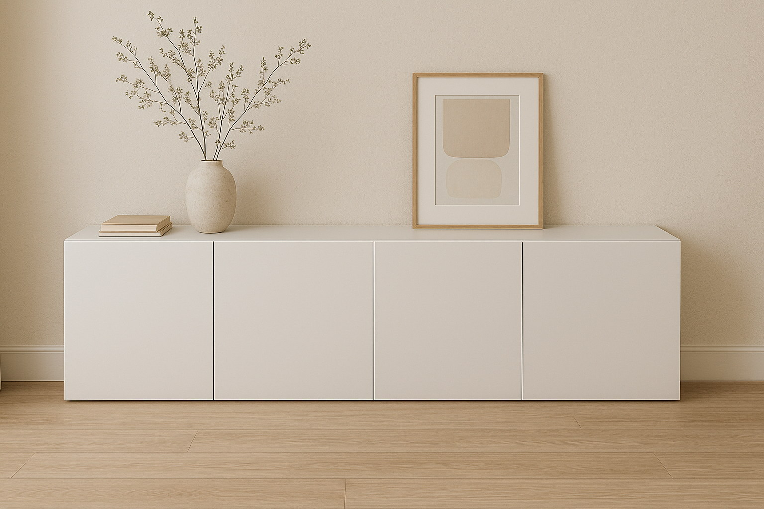 | Muebles altos y pesados → salón aplastado. | Sustituir piezas voluminosas por módulos bajos y ligeros, con frentes lisos, que permitan que la luz circule y el espacio respire. |