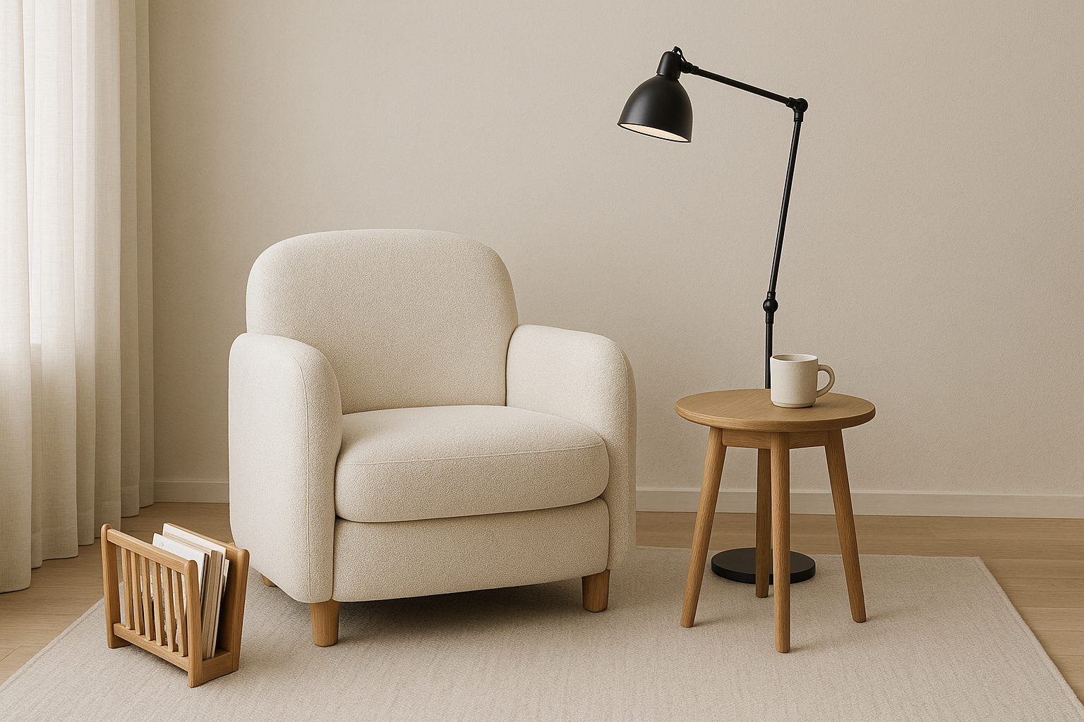 • Roble o fresno con acabado mate o al aceite para una textura táctil. • Evitar barnices brillantes. | Las superficies naturales y mates hacen que la madera “respire” mejor y refuerzan la sensación cálida y serena del salón nórdico. |